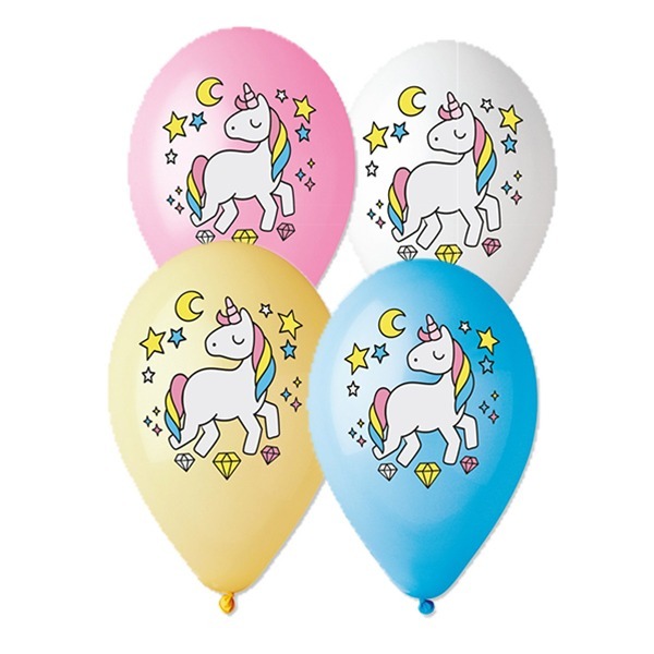 בלוני מסיבה בצבעים עם הדפסת חד קרן – 5 יח'