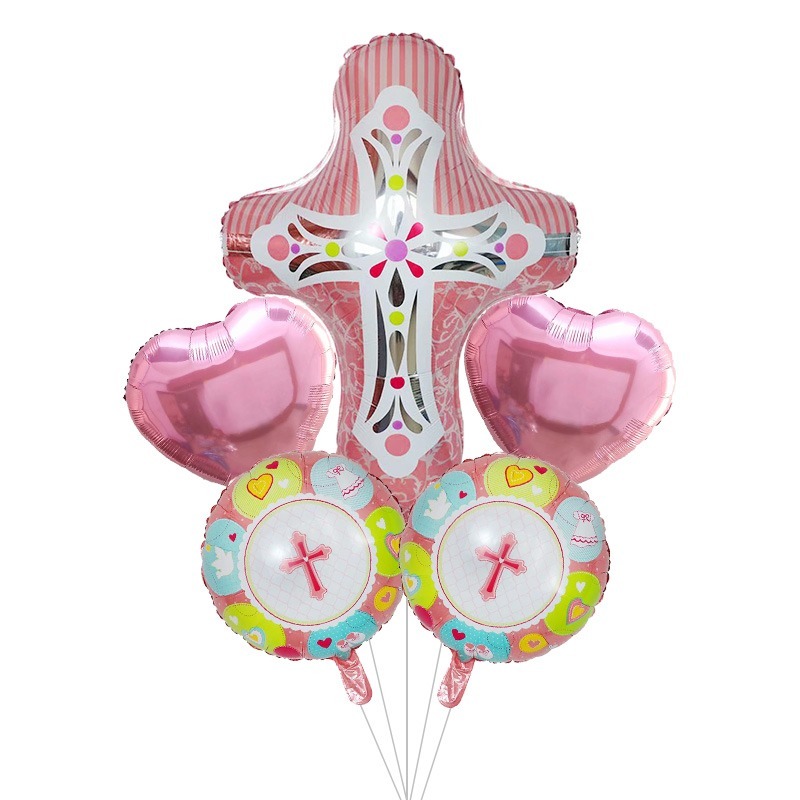 זר בלונים טקס המיסה – צבע ורוד – 5 בלונים : 1 צלב 30" – 2 לבבות – 2 עגולים