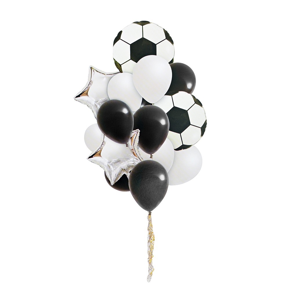 זר בלונים יום הולדת כדורגל – 16 בלונים: 2 בלונים 18" בצורת כדורגל – 2 בלונים 18" בצורת כוכב – 12 בלונים לטקס 12" לבן ושחור