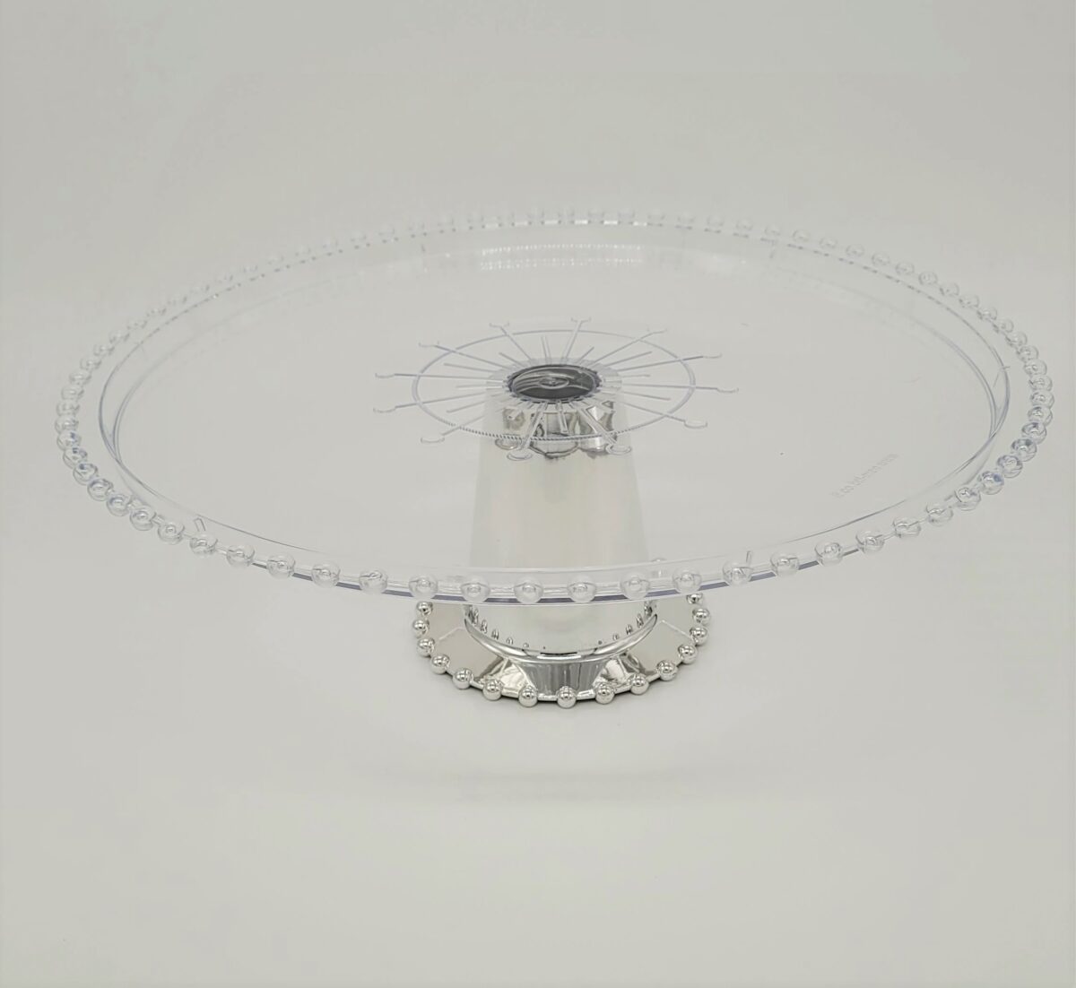 מעמד לעוגה שקוף עם רגל כסף קצרה כ-11 ס"מ – קוטר 37 ס"מ